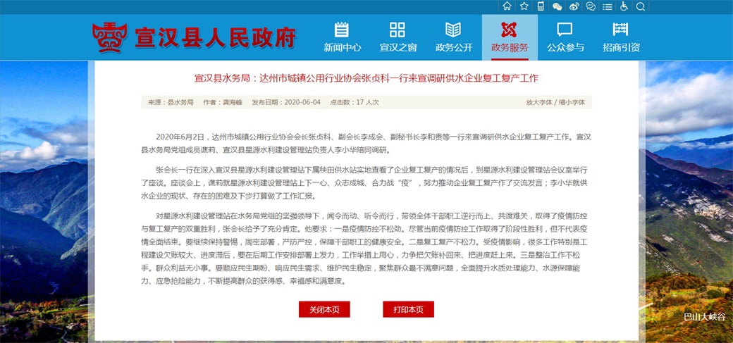 轉(zhuǎn)發(fā)宣漢縣水務(wù)局關(guān)于協(xié)會張貞科一行調(diào)研供水企業(yè)復(fù)工復(fù)產(chǎn)新聞稿