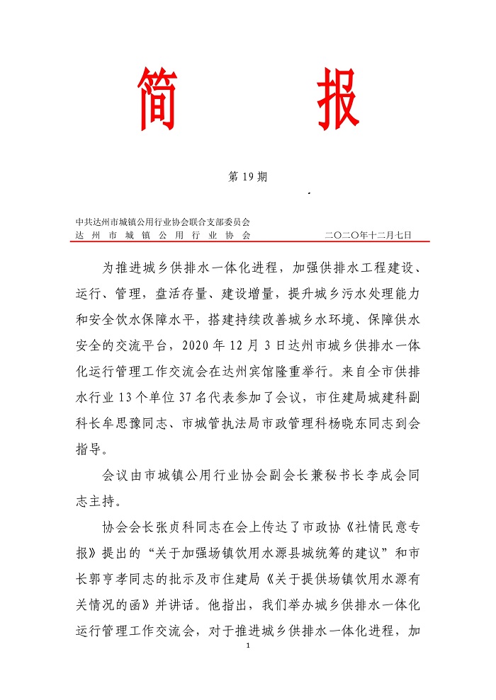 中共達(dá)州市城鎮(zhèn)公用行業(yè)協(xié)會(huì)聯(lián)合支部委員會(huì)2020年第十九期簡(jiǎn)報(bào)
