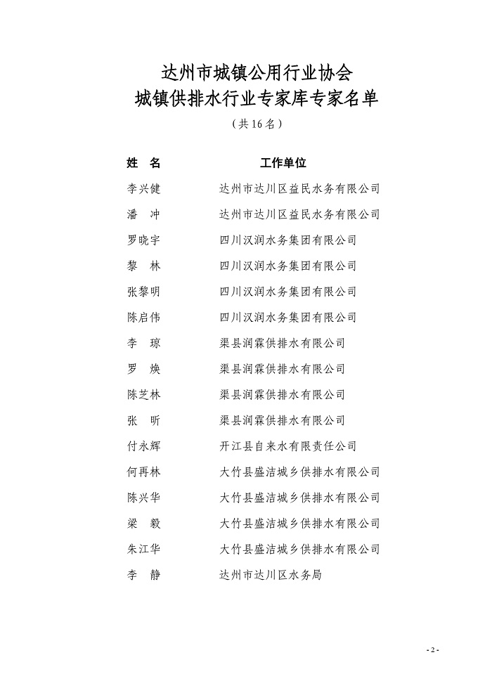 達(dá)州市城鎮(zhèn)公用行業(yè)協(xié)會(huì)關(guān)于聘用城鎮(zhèn)供排水專(zhuān)家的通知