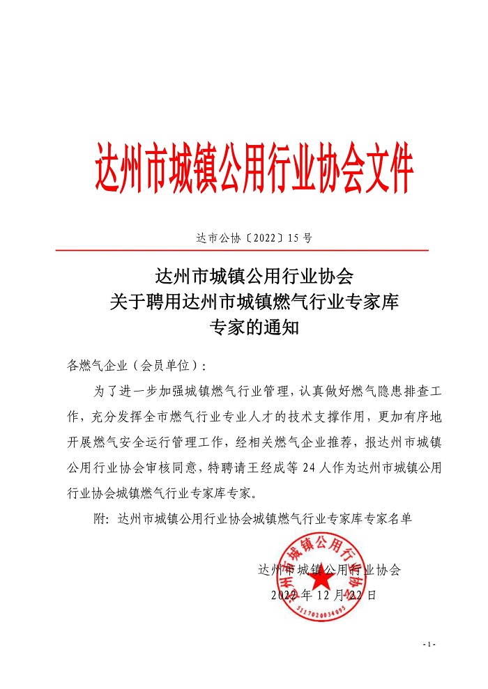 達(dá)州市城鎮(zhèn)公用行業(yè)協(xié)會(huì)關(guān)于聘用城鎮(zhèn)燃?xì)鈱<业耐ㄖ?