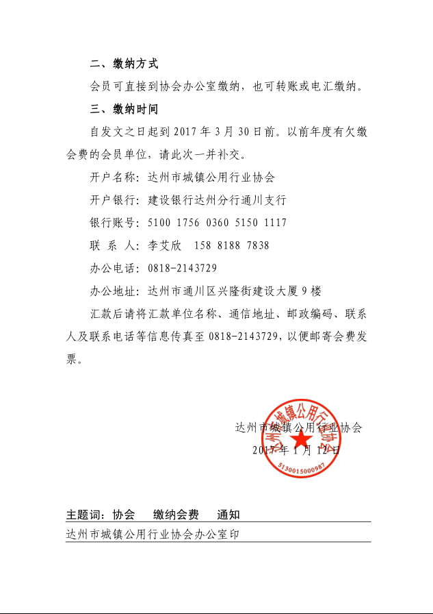 達州市公用行業(yè)協(xié)會關(guān)于繳納2017年度會費的通知