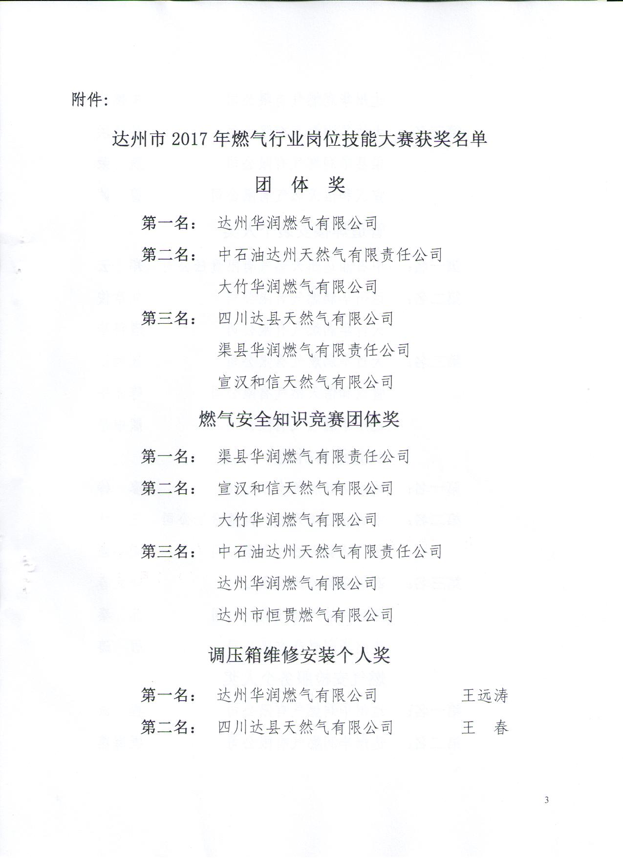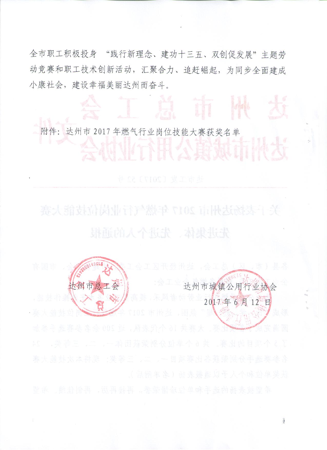 關(guān)于表揚(yáng)2017年達(dá)州市燃?xì)庑袠I(yè)崗位技能大賽先進(jìn)集體、先進(jìn)個人的通報