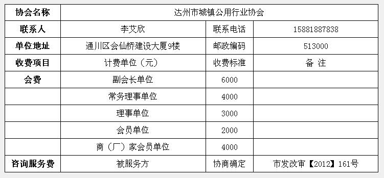 達州市城鎮(zhèn)公用行業(yè)協(xié)會收費公示表