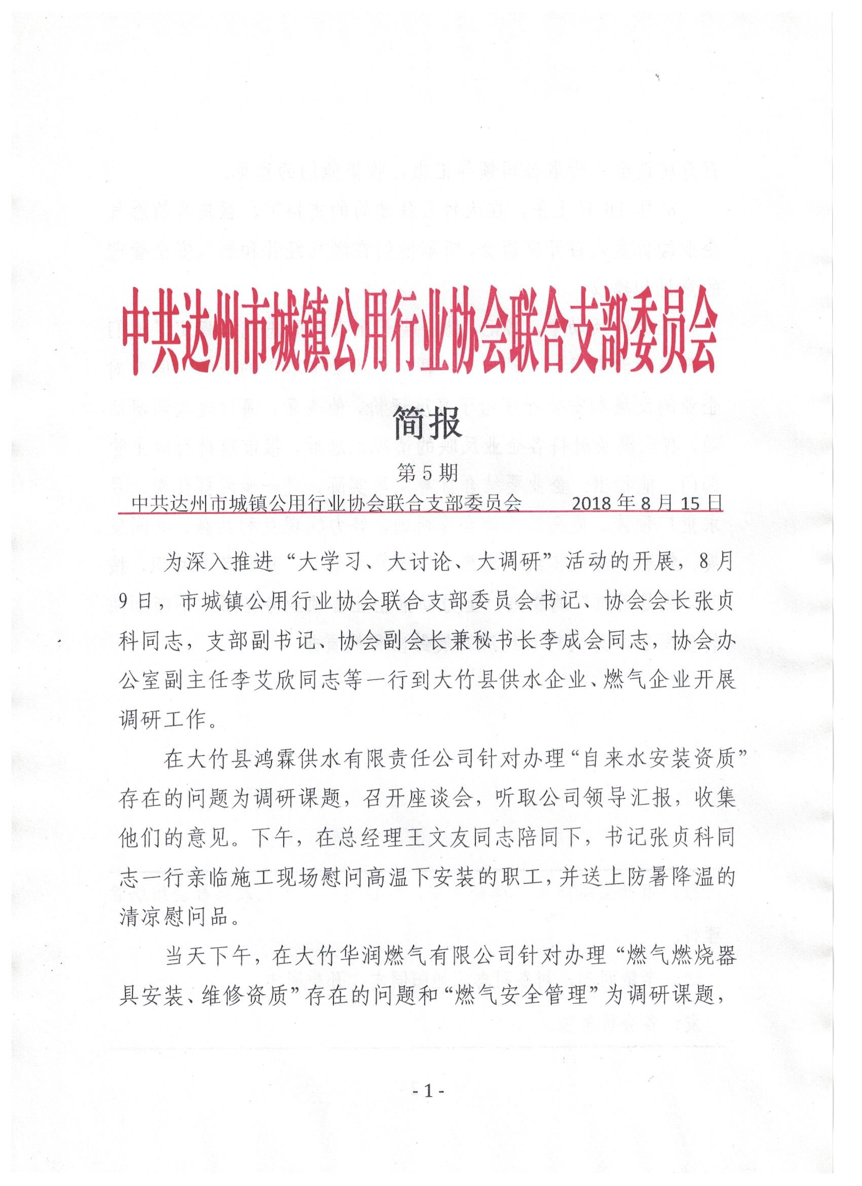 中共達(dá)州市城鎮(zhèn)公用行業(yè)協(xié)會聯(lián)合支部委員會2018年第五期簡報(bào)