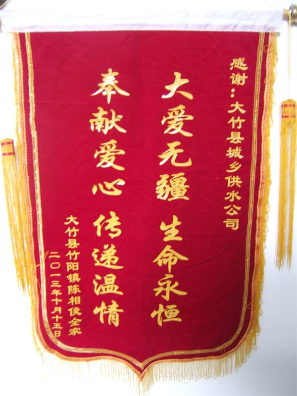 錦旗致謝大竹供水人。近日,大竹縣白血患兒陳相俊之父,將一面印有“奉獻愛心傳遞溫情、大愛無疆生命永恒”的錦旗送到了供水公司,表達感激之情。