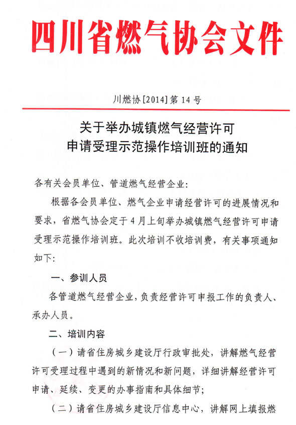 關(guān)于舉辦城鎮(zhèn)燃?xì)饨?jīng)營(yíng)許可申請(qǐng)受理示范操作培訓(xùn)班的通知
