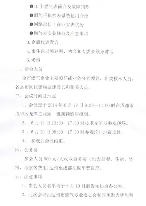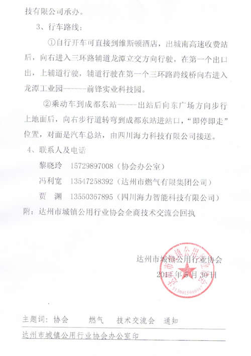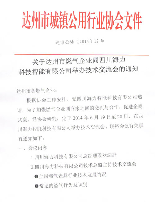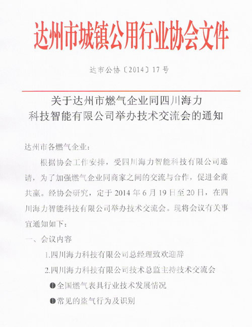 關(guān)于達(dá)州市燃?xì)馄髽I(yè)同四川海力科技智能有限公司舉辦技術(shù)交流會(huì)的通知